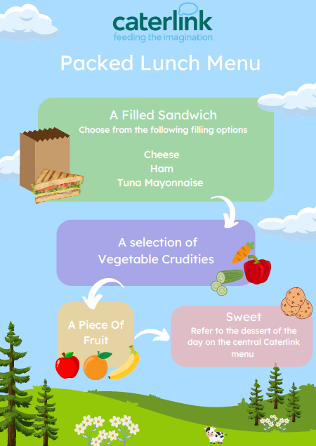 There is a choice of four menu options daily including a filled jacket potato and a healthy packed lunch. These menus roll on a three-weekly rota. From time to time, Caterlink offer special themed menus which will be shared with parents in advance. Alternative to Caterlink's meals, a healthy packed lunch can be brought in from home. We ask that children do not bring fizzy drinks, sweets or chocolate to school. We are a healthy school and promote a balanced diet for all our pupils. It is also very important that children do not bring any food items containing nuts into school, including Nutella, as we are a nut-free environment.